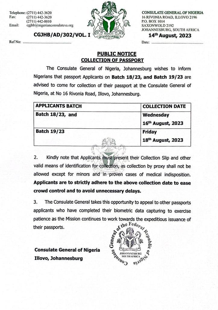 The Consulate General of Nigeria, Johannesburg invites all applicants who have completed biometric capturing to collect their passports on the scheduled dates Wednesday 16th and Friday, 18th of August 2023.